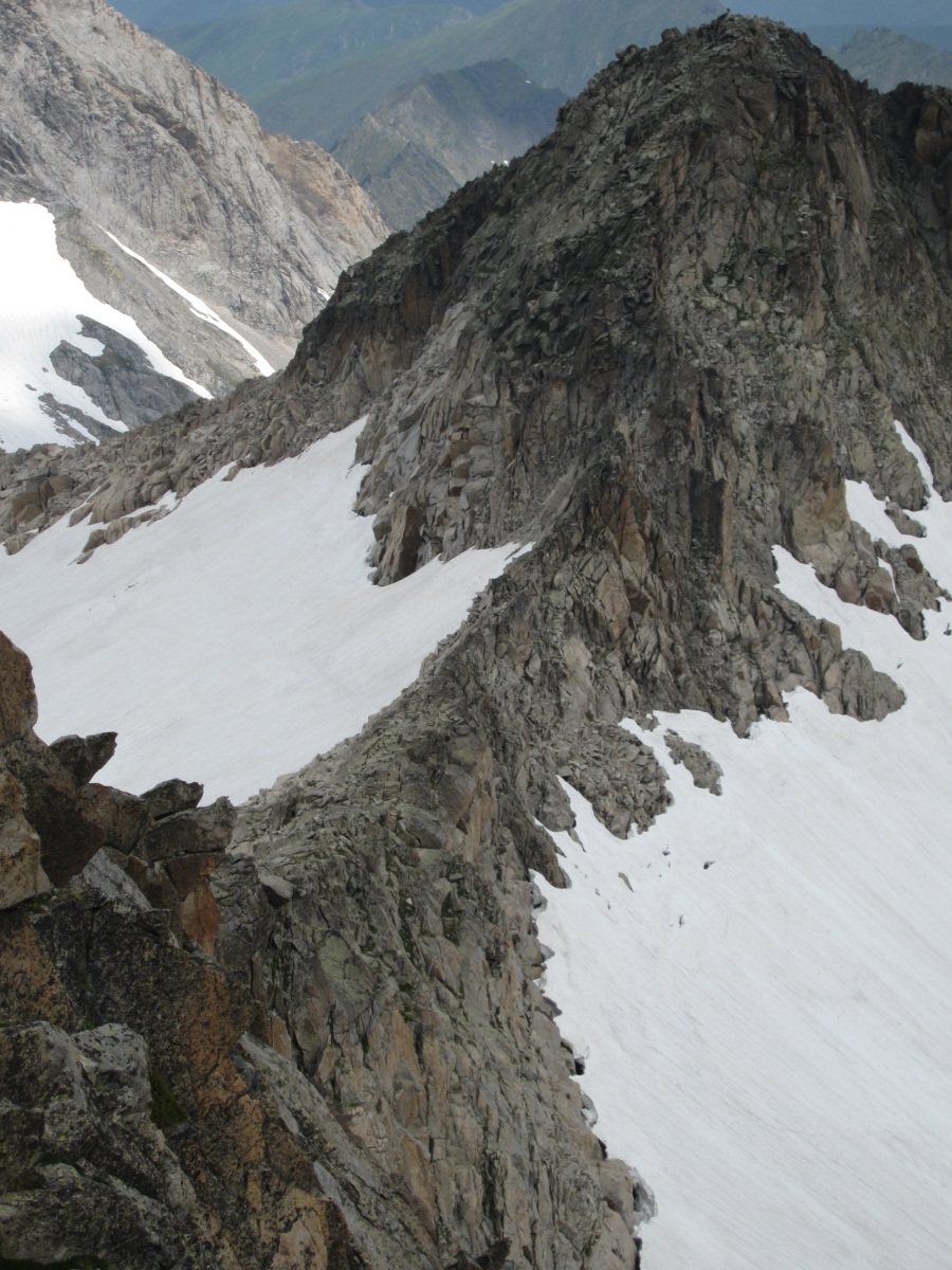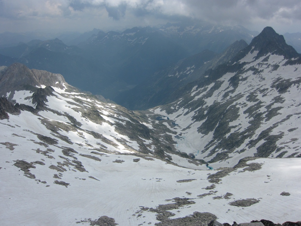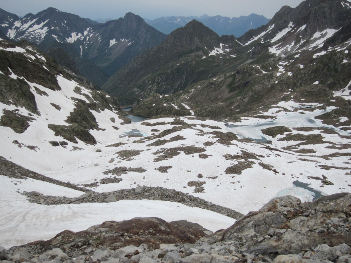 arriving at 2,900m with another 15 people. Luckily they were heading up Tuc de Mulleres (the summit), rather than to the col, so Klaas and I turned away from the group and made for the col, where we paused for lunch, staring at the infamous descent that Klaas’s guide advised using a rope for.