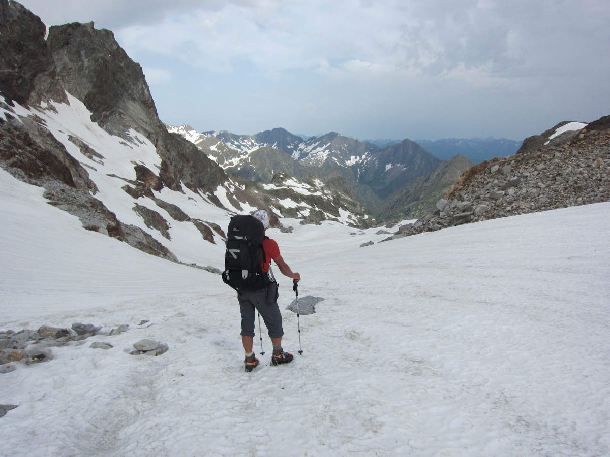 Having dropped down a bit we had a slight climb up to Portal de Remune, then a seemingly endless descent towards Benasque. There was a huge amount of snow for the top half, which caused us a few problems with