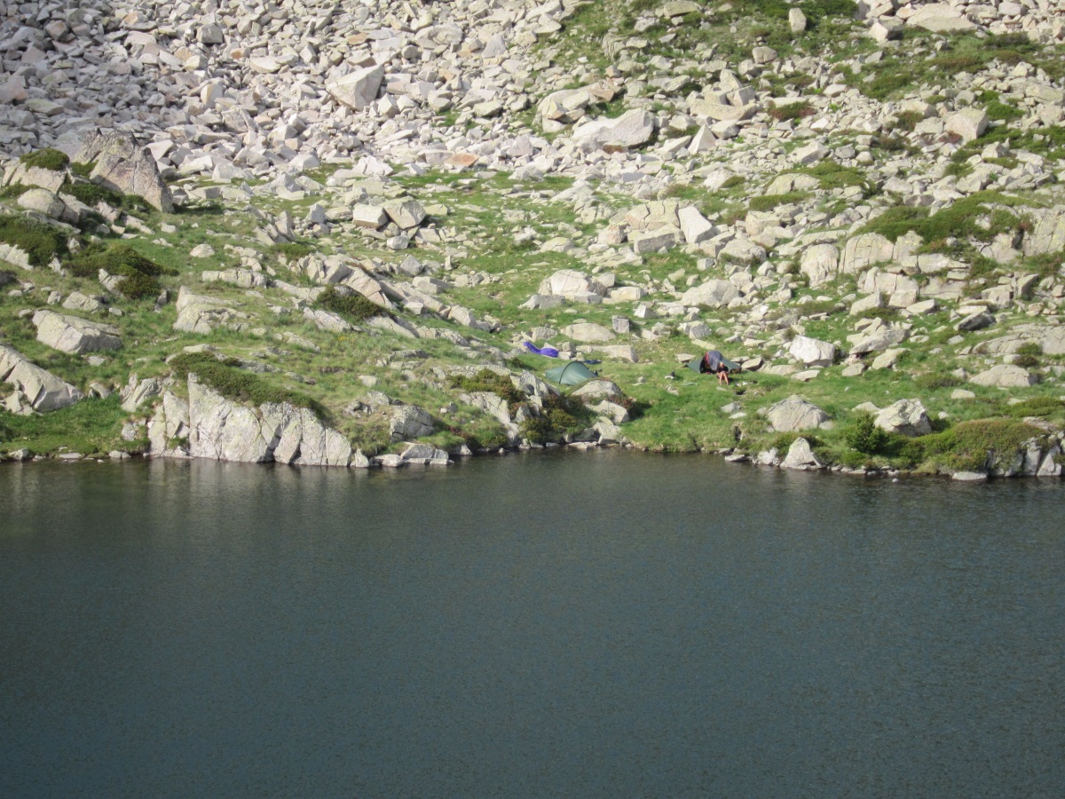 It was all worth it though, as we’re now camped by Estanyet de Marimanya d’Isavarre, one of the nicest lakes in the universe, and home to possibly the best bivouac site ever (you might be able to make out the tents in the centre of the photo below). The lake is warm enough that I swam right across it (around 5 minutes) then had a proper wash when I got back so I’m now feeling lovely and clean. We’re at 2,400m, miles from anyone, and the only sound is a little stream trickling out from a small patch of snow near the lake. It doesn’t get much better than this.