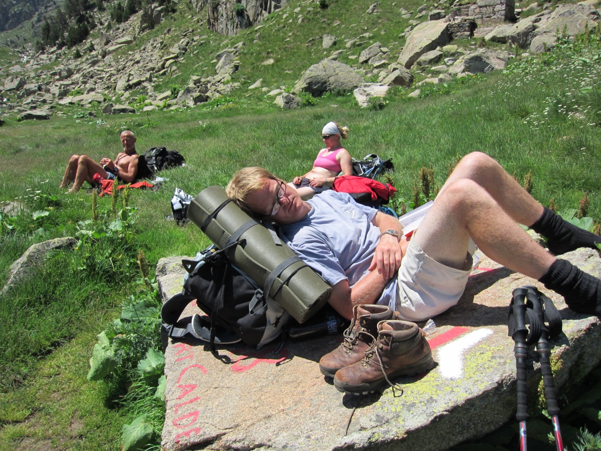 At this point Klaas was walking down the ridge. He too had realised we’d gone different ways, but had decided that searching for someone in the maze was pointless, so had carried on down towards the refuge. Just before Enric Pujol the path makes a difficult crossing of the outflow from the lake in a little ravine, which the guidebook warns may not be possible with a big pack. Klaas didn’t like the look of the crossing so had descended on the south side of the stream, stopping slightly further down to wait for me at Estany de Llavera.