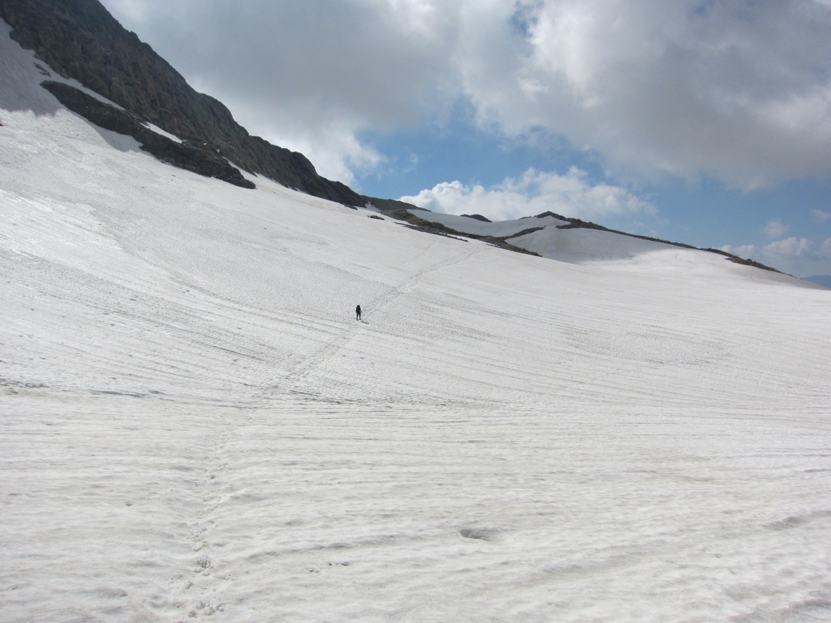 The sky still looked a bit suspect this morning but the worst it managed was a few short showers. Klaas and I had a great climb from our lakeside bivouac site (first photo, lake is left of centre) up to Col des Gourgs-Blancs, ending with an enormous snowfield leading up to the col (second photo). For some reason that snowfield gave me a real buzz - it felt so remote, like it represented what the HRP was all about.